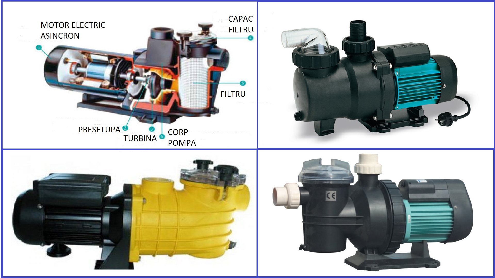 Acest tip de pompe folosesc motoare electrice asincrone care pot fi trifazate sau monofazate. Motoarele electrice sunt inchise si ventilate, avand carcasa din aluminiu sau inox. Componentele pompelor de piscina sunt fabricate din material termoplastic rezistent la coroziune si actiunea indelungata a agentilor chimici dizolvati in apa, necesari tratarii apei.